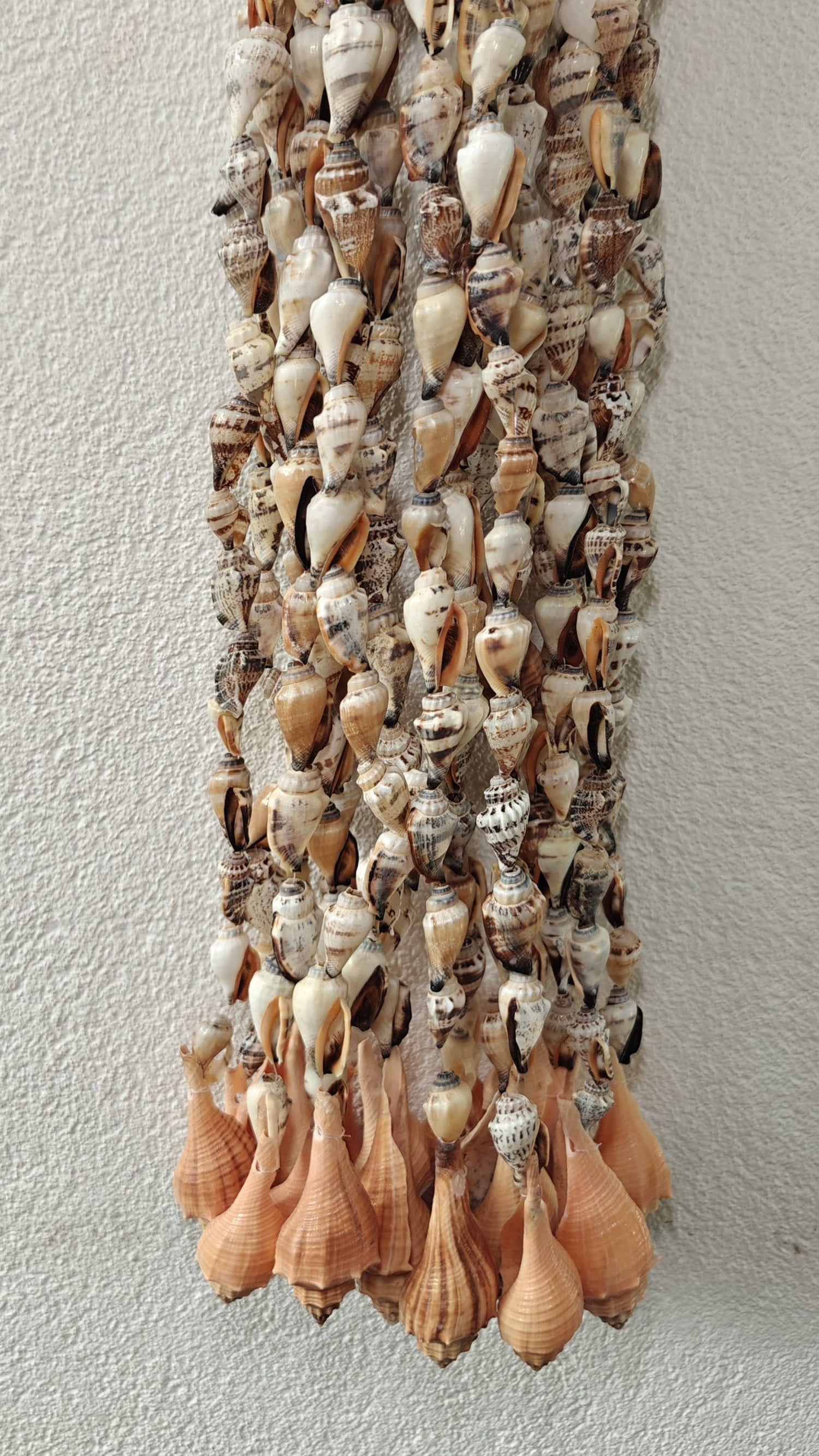 The hanger consists of 10 double strands, carefully assembled from different types of shells. Each strand is richly decorated with natural shells, with a focus on smaller shells and larger, impressive shells adorning the lower part.