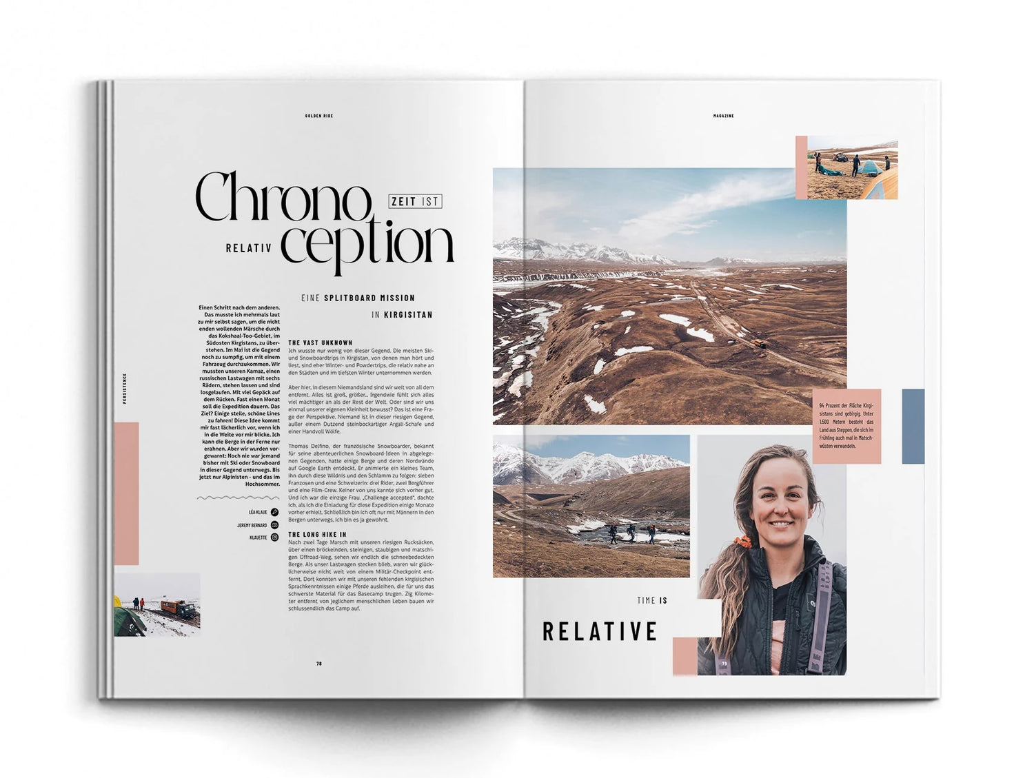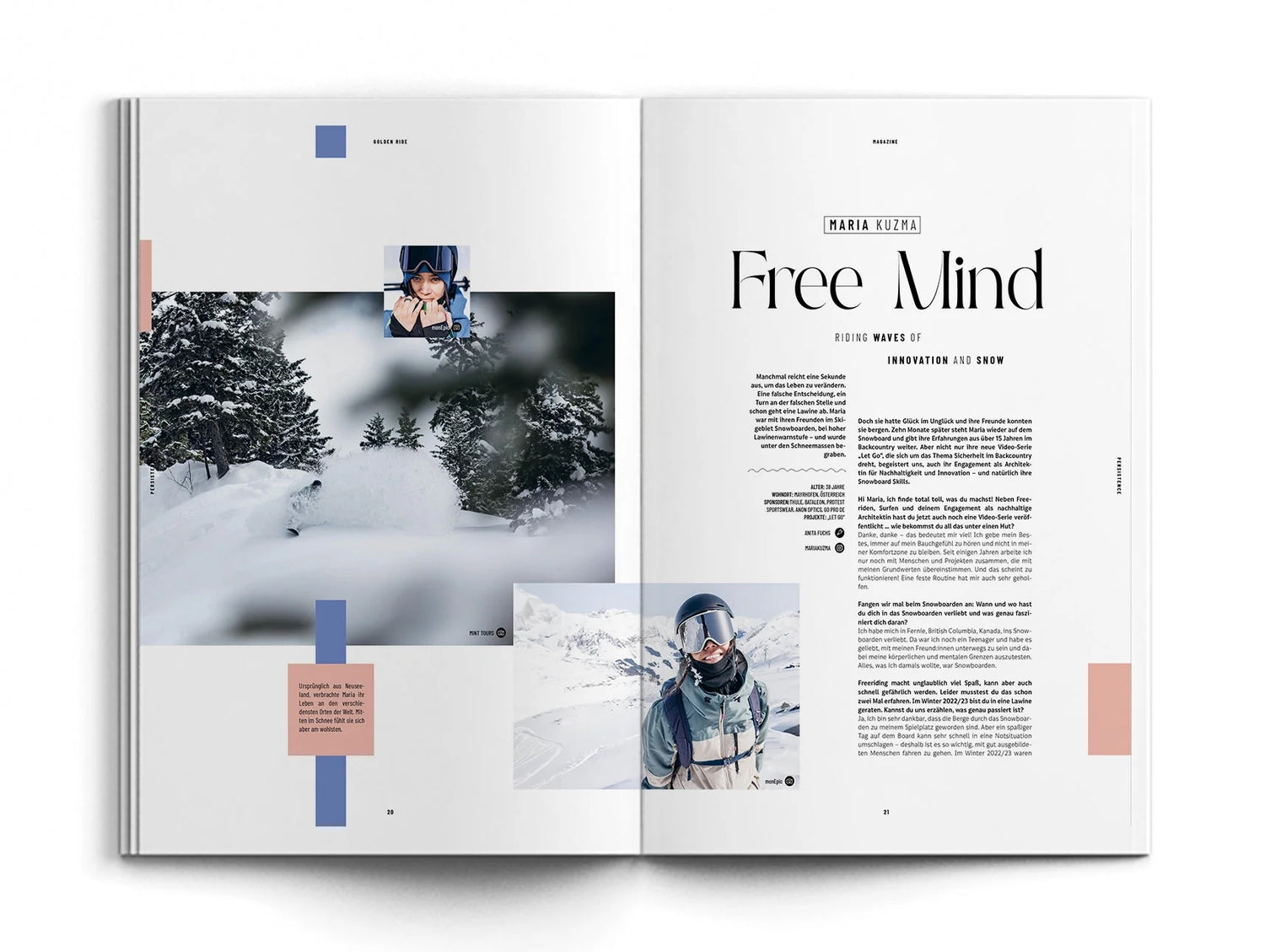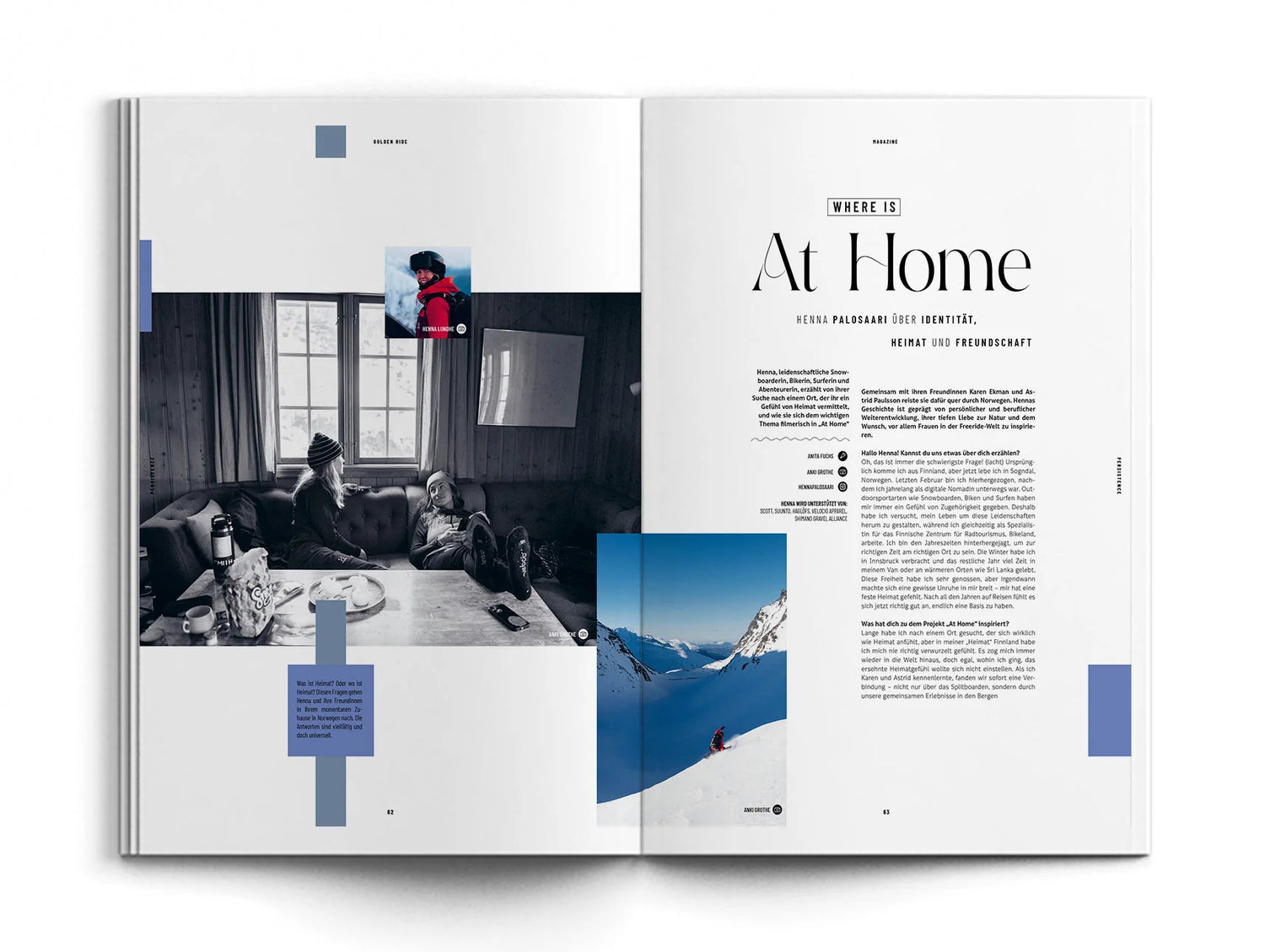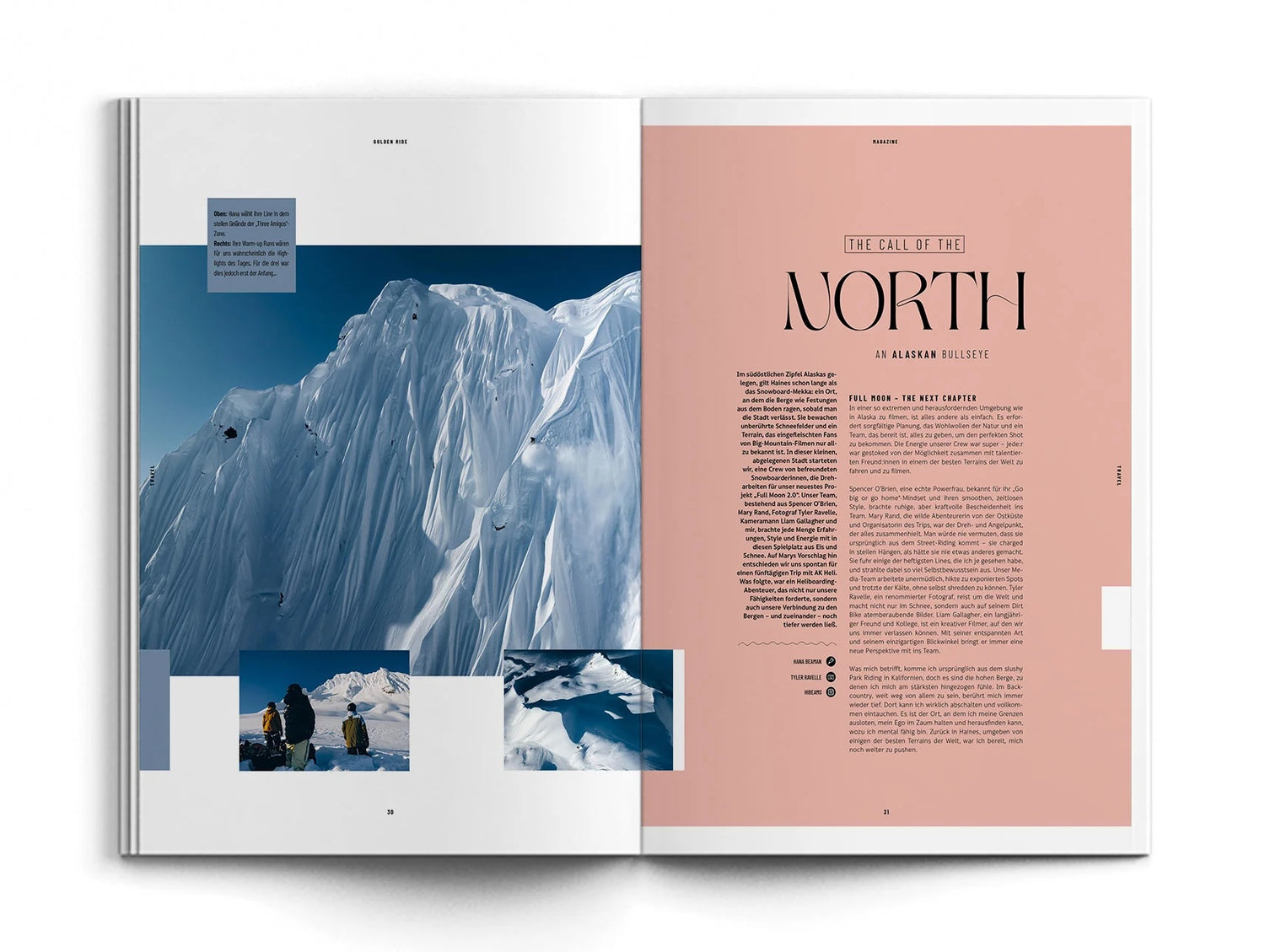 Hinter dem nächsten Waldstück, der nächsten Kuppe oder dem nächsten Gipfel, kann sich im Winter eine ganz neue Welt eröffnen. Die Berge, die du noch vom Sommer kennst, sind kaum wieder zu erkennen und verwandeln sich täglich. Der Winter mag als ruhige Zeit gelten, doch in den Bergen ist alles ist im Fluss, nichts bleibt, wie es ist und alles kann sich über Nacht verändern. Alles ist möglich und das macht den Winter so magisch. In dieser Ausgabe drehen sich die Storys natürlich wie immer über mutige Frauen. Es geht um Sanftheit, Heimat, Abenteuer und Gemeinschaft. Um Surfen im Schnee und auf Wasser – und weil auch wir nicht stehen bleiben, gibt es Golden Ride ab sofort auch auf Englisch!