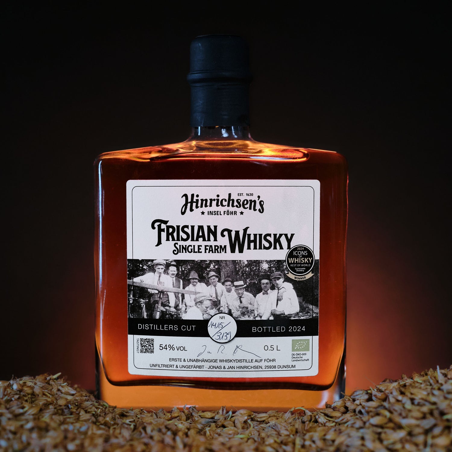 Die Hinrichsen Farm verwendet ihr eigenes vom Nordseewind gereiftes Biogetreide, das auf dem Malzboden gemälzt, gebraut und in der hofeigenen Distillery gebrannt wird. Die anschließende Fasslagerung erfolgt auf dem Heuboden 500m hinter dem Deich und verleiht dem Whisky einen einzigartigen Geschmack beeinflusst von Wind und Wetter der Nordseeinsel Föhr.