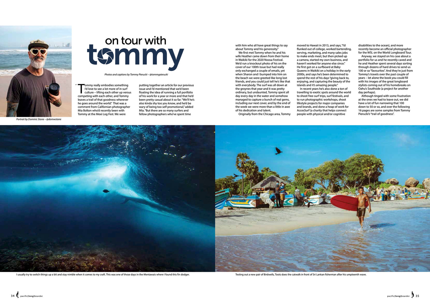 Tommy Pierucki’s homebreak is Queens at Waikiki, but we’re really not sure how much time he actually gets to spend there. In recent years he’s done a ton of travelling to exotic spots around the world to shoot surf festivals, free-surf tours, lifestyle projects for various brands, run photographic workshops, and work as an official photographer for the WSL World Longboard Tour. He’s also scored five of our covers since we first hooked up with him five years ago, and this issue we’ve (finally) assembled a collection of favourites for a 16-page portfolio. We could have filled a book.