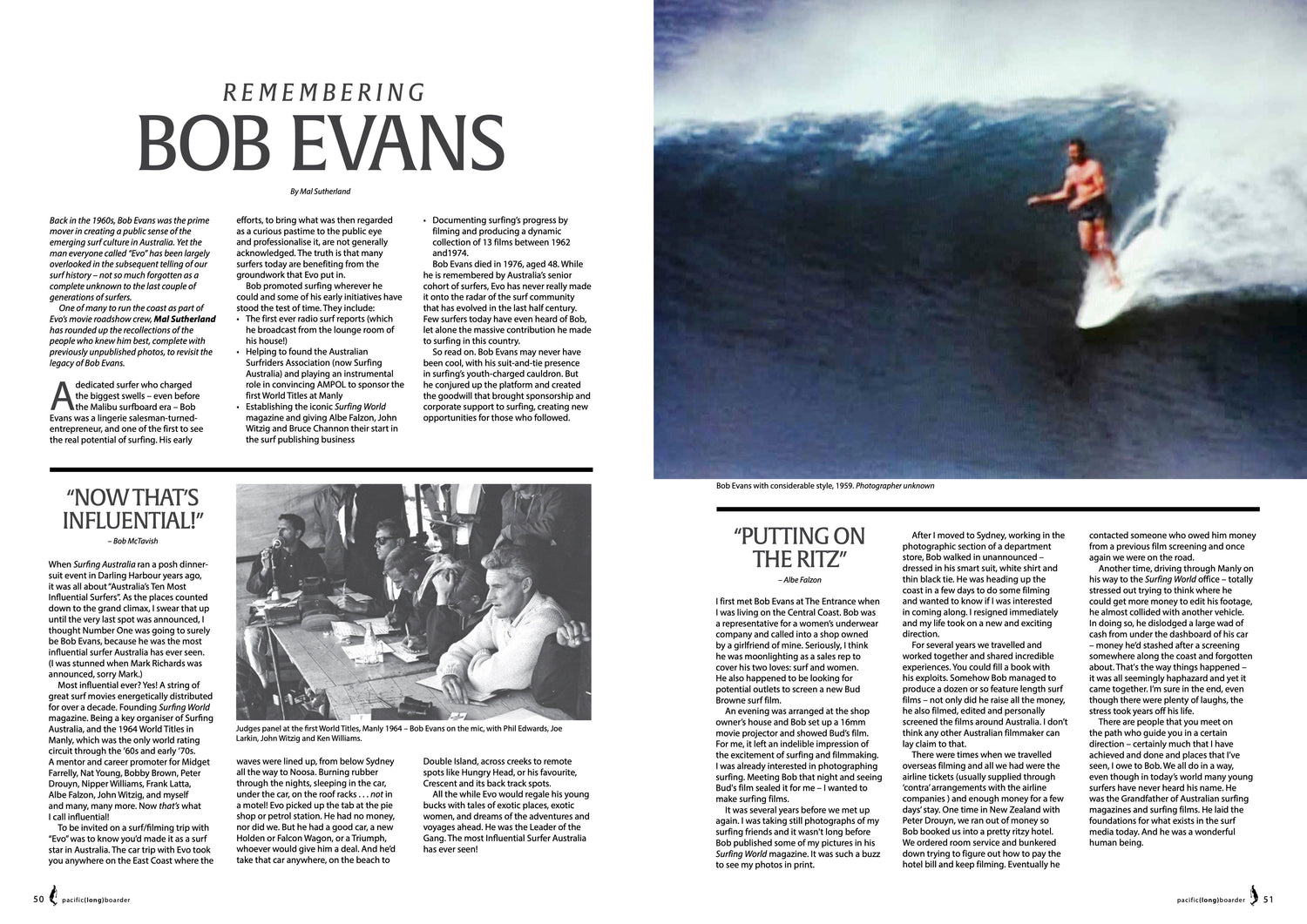Back in the 1960s, Bob Evans was THE prime mover in creating a public sense of the emerging surf culture in Australia. Yet the man everyone called “Evo” has been largely overlooked in the subsequent telling of our surf history - not so much forgotten as a complete unknown to the last couple of generations of surfers. One of many to run the coast as part of Evo’s movie roadshow crew, Mal Sutherland has rounded up the recollections of the people who knew him best, complete with previously unpublished photos, to revisit the legacy of Bob Evans.