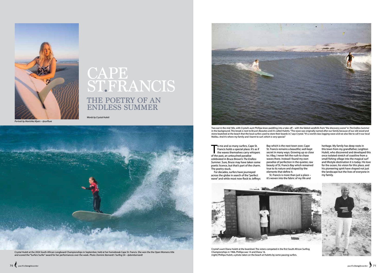 Most surfers probably haven’t heard much at all about Cape St. Francis since Bruce Brown tripped us all out on it in The Endless Summer, but third generation local Crystal Hulett brings us up to date - and shares some previously unpublished family photos from back in the day. Crystal’s aunties surfed in the South African Championships in the ’60s, and the right point inside Bruce’s Beauties is actually named “Huletts”. Crystal recently won the 2024 SA Open Womens title right there at Cape St. Francis, and we’ve also got some cracking surf shots of Crystal and her boyfriend (and WSL star) Stevie Sawyer. Says Crystal: “Sure, Bruce may have taken some poetic licence, but that’s part of the charm. The poetry stuck.”